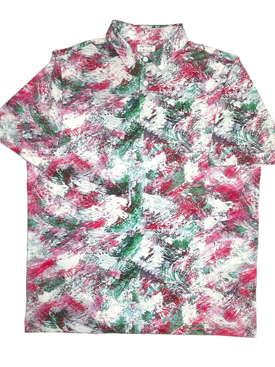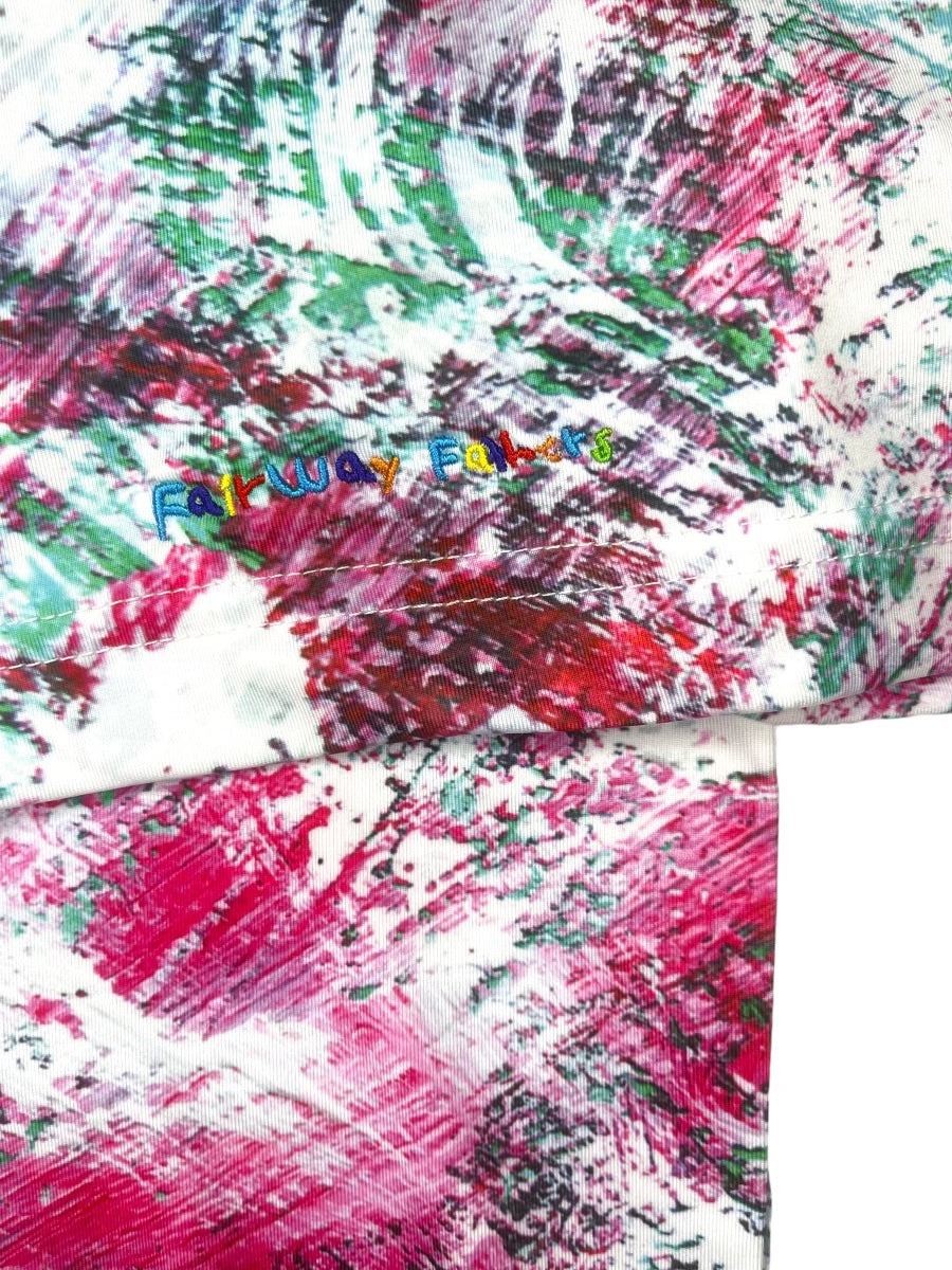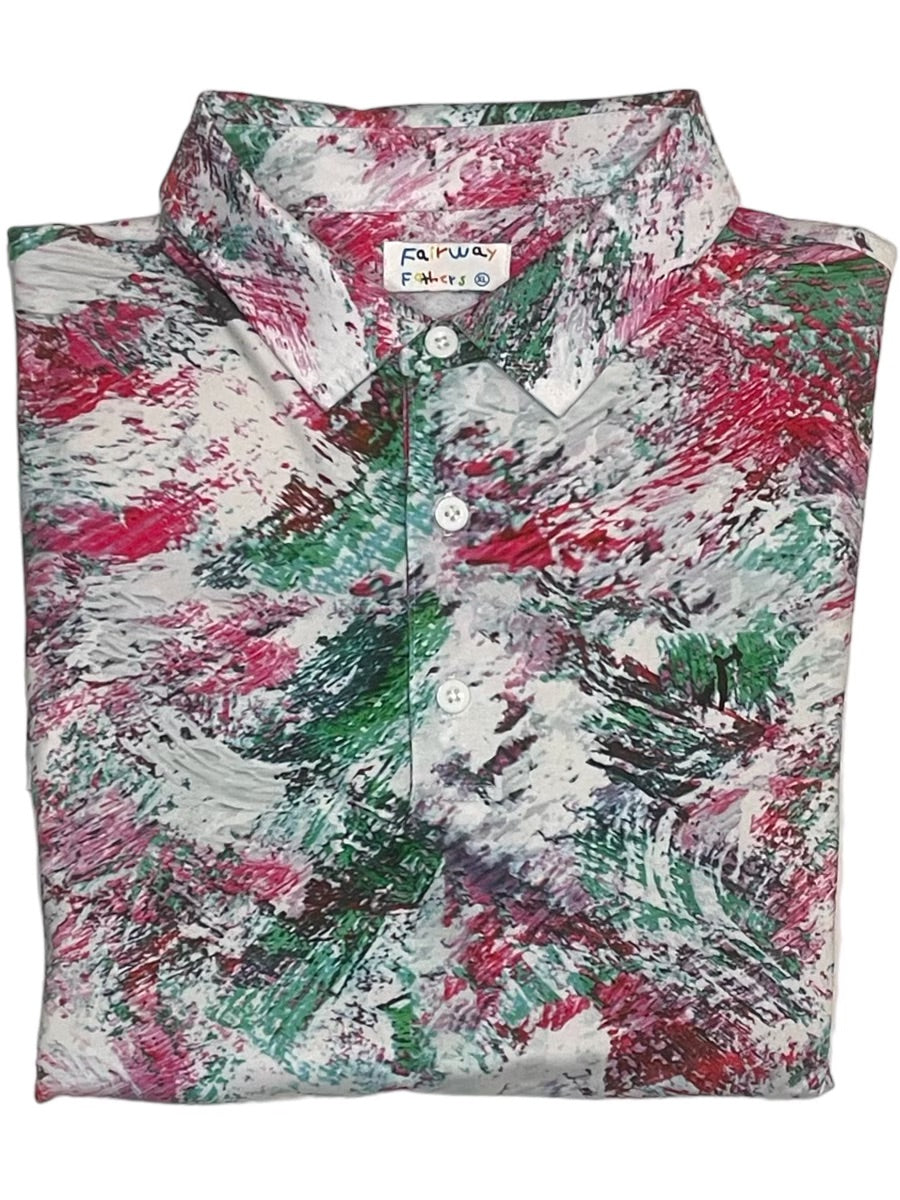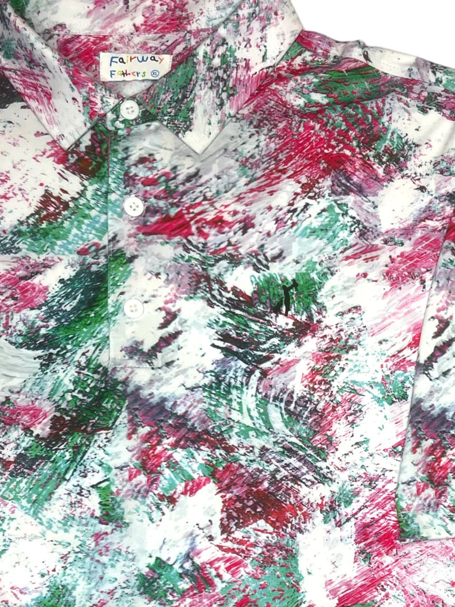 The Few Extra Strokes golf polo is a stylish and eye-catching shirt that will make a statement on the golf course. This polo features a vibrant design with shades of pinks and greens, giving it a fun and playful look.