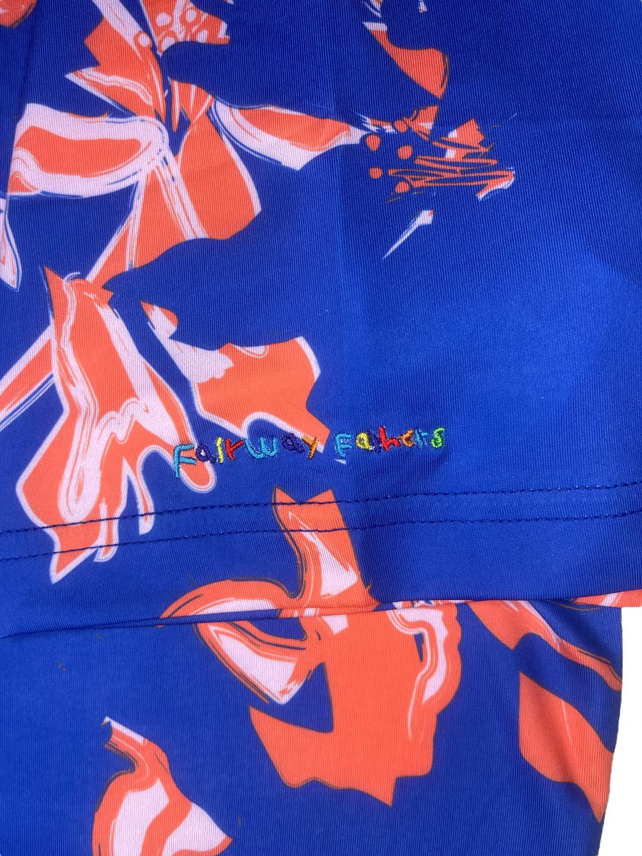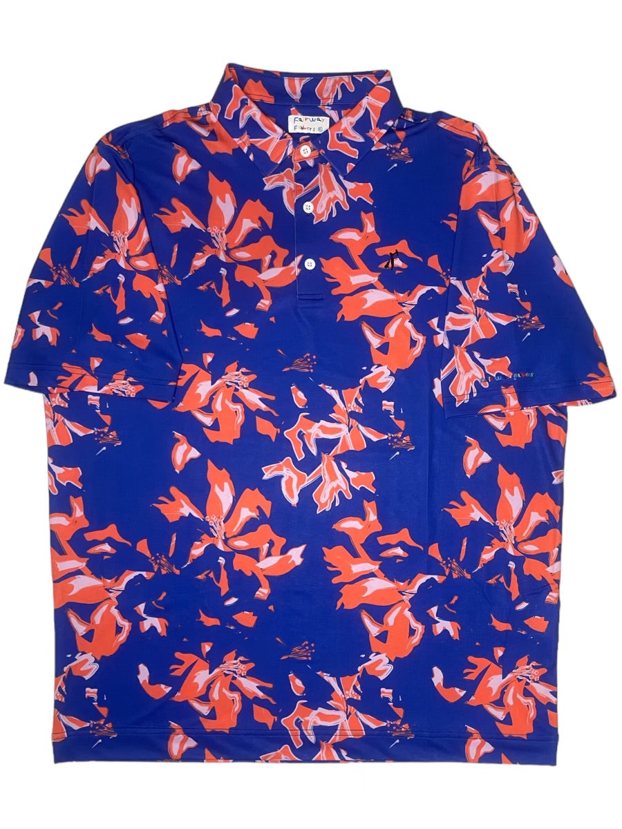 Whether worn on the golf course or for casual outings, this blue golf polo with orange flowers is sure to make a fashion statement. Its unique design and vibrant colors will catch the attention of others and bring a refreshing and lively vibe to any outfit.