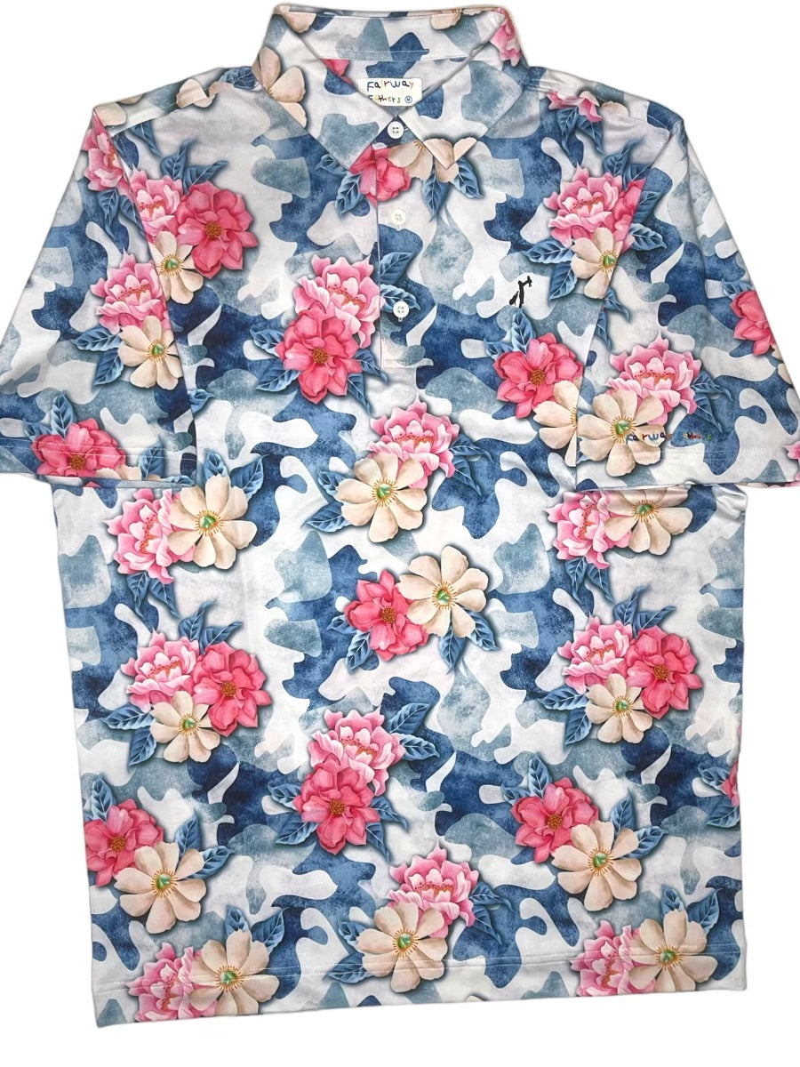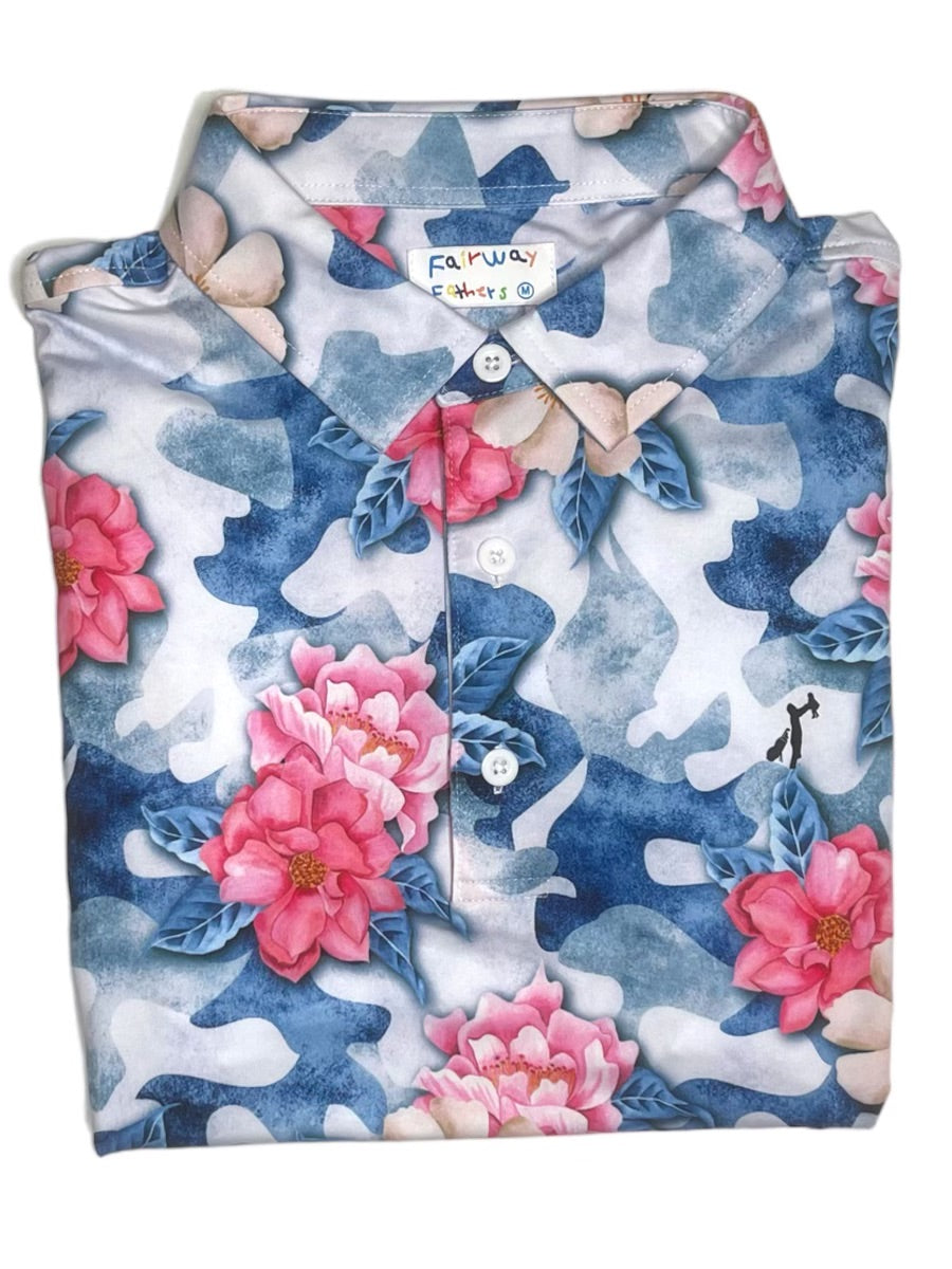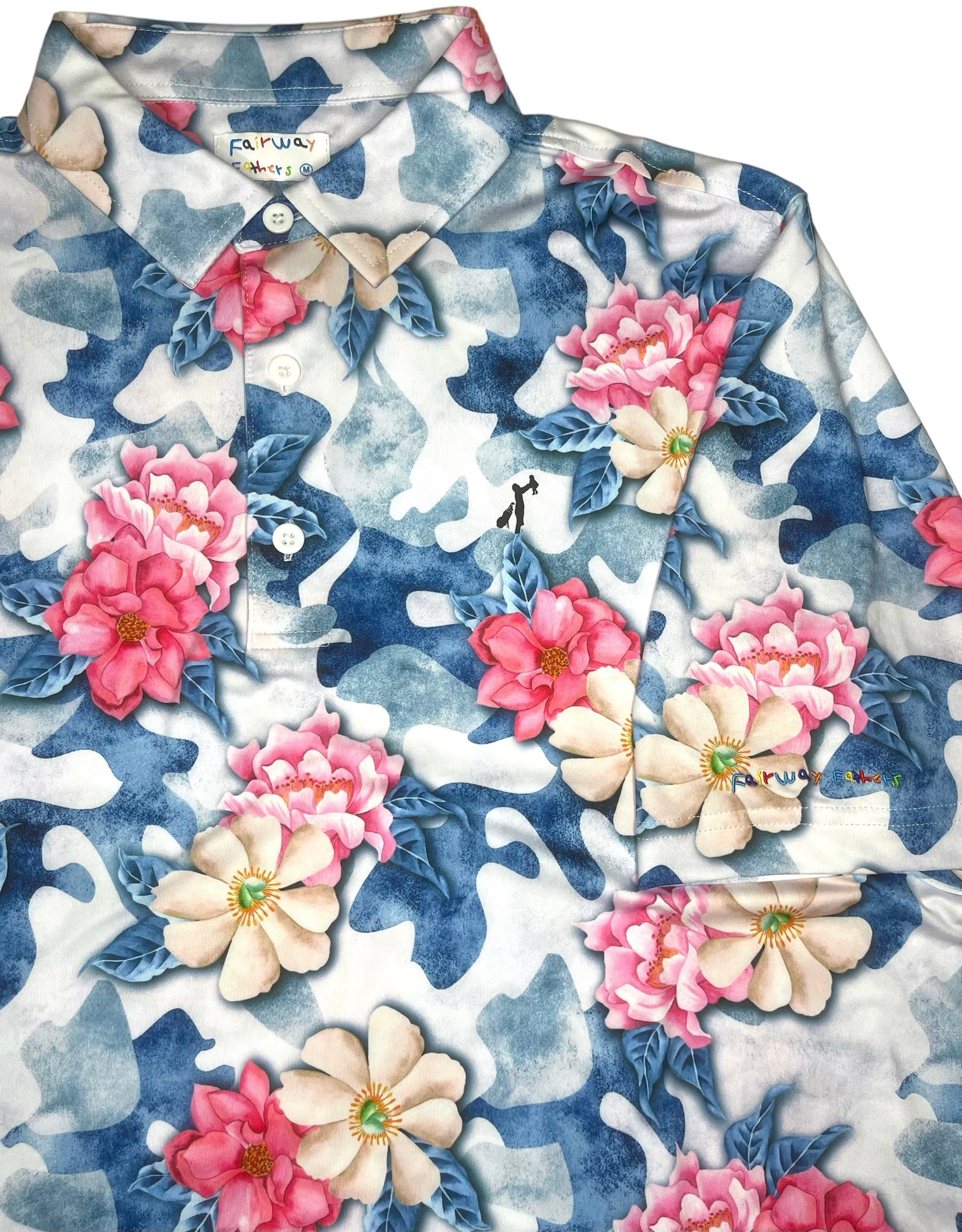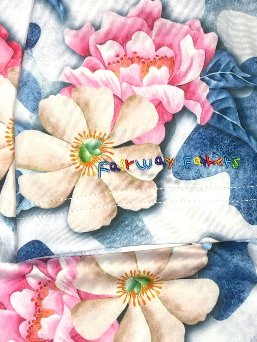 The Leighed Up golf polo is a vibrant and eye-catching garment designed with golf enthusiasts in mind. Its unique design features vibrant blue leaf patterns, along with pops of pink and yellow flowers. This striking combination of colors reflects a playful and lively spirit while maintaining a touch of elegance.